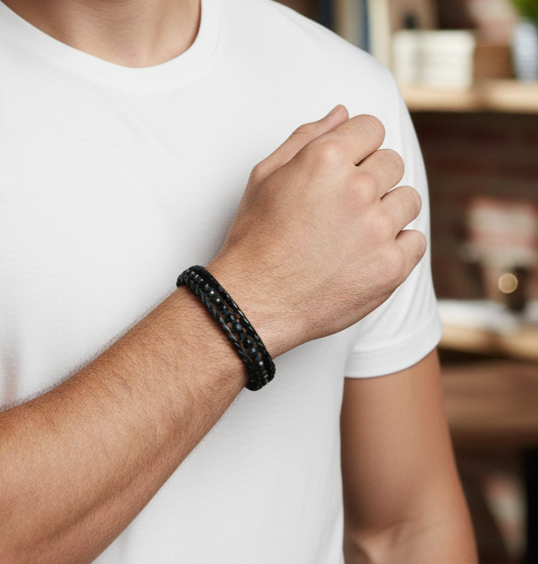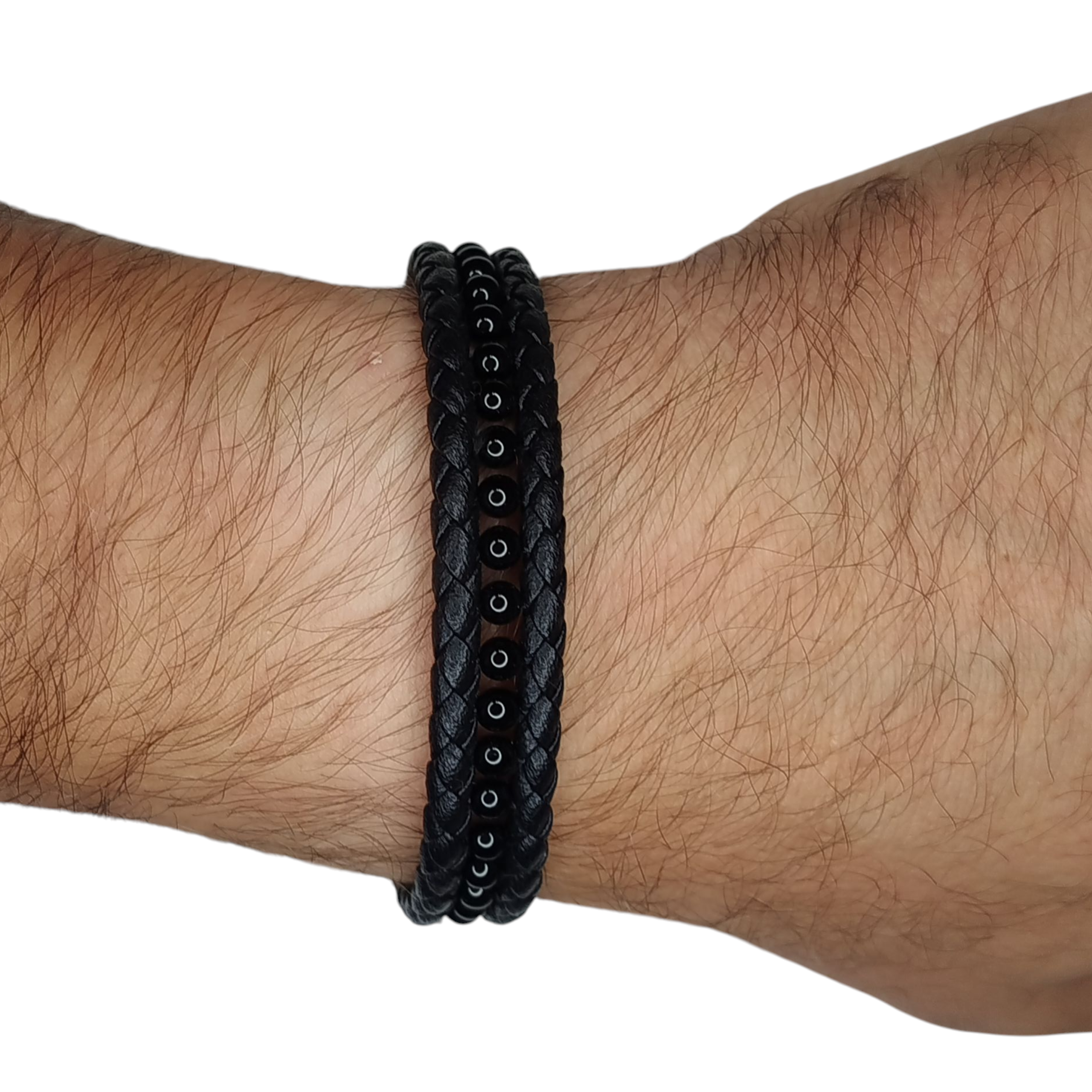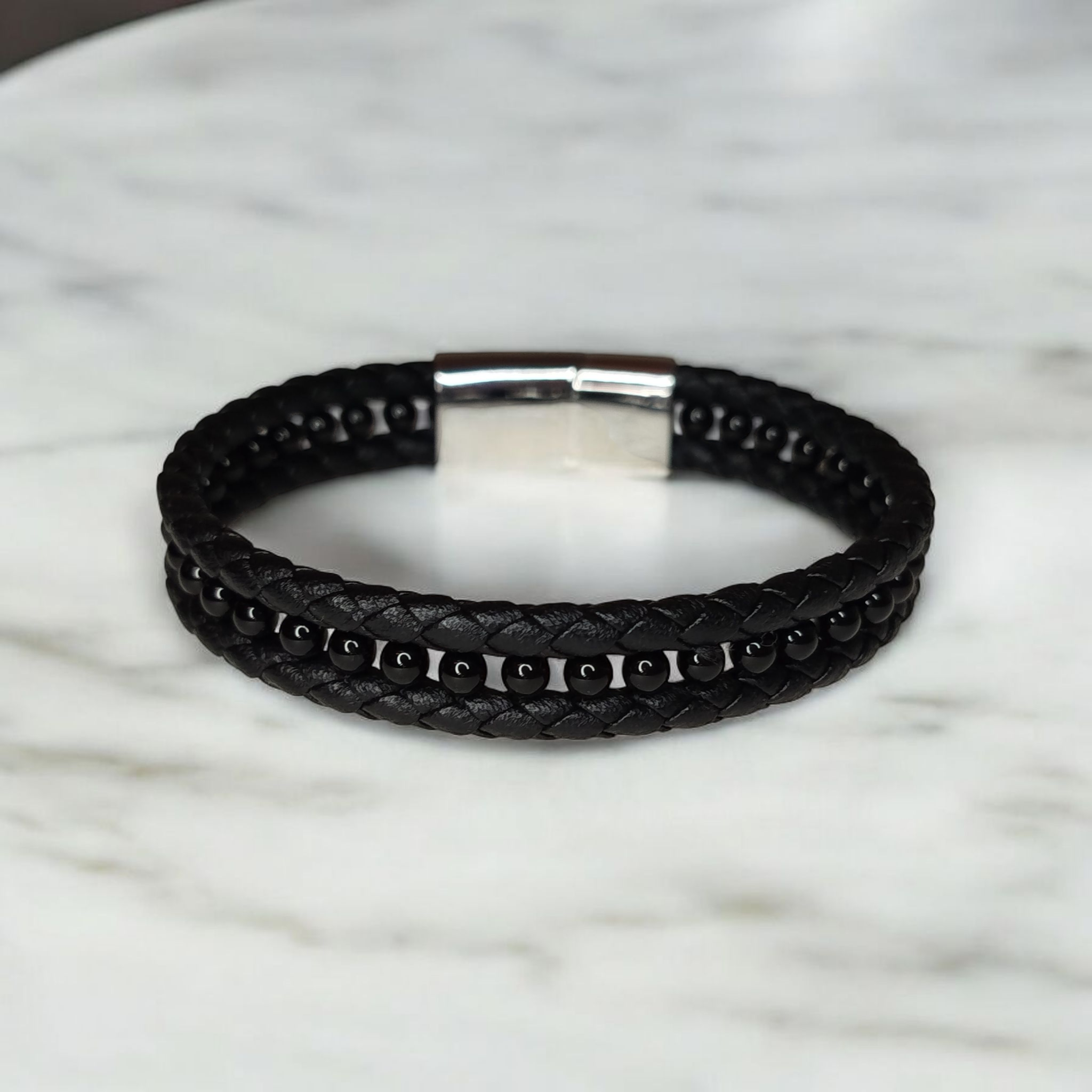 Κομψότητα και δυναμισμός. Ανδρικό βραχιόλι σε σκούρο καφέ χρώμα, με λεπτομέρεια από μια σειρά ημιπολύτιμων λίθων Μάτι του Τίγρη για ένα διαχρονικό, αρρενωπό στυλ. Διαθέτει ασφαλές κούμπωμα από ανοξείδωτο ατσάλι. Ιδανικό για κάθε εμφάνιση.